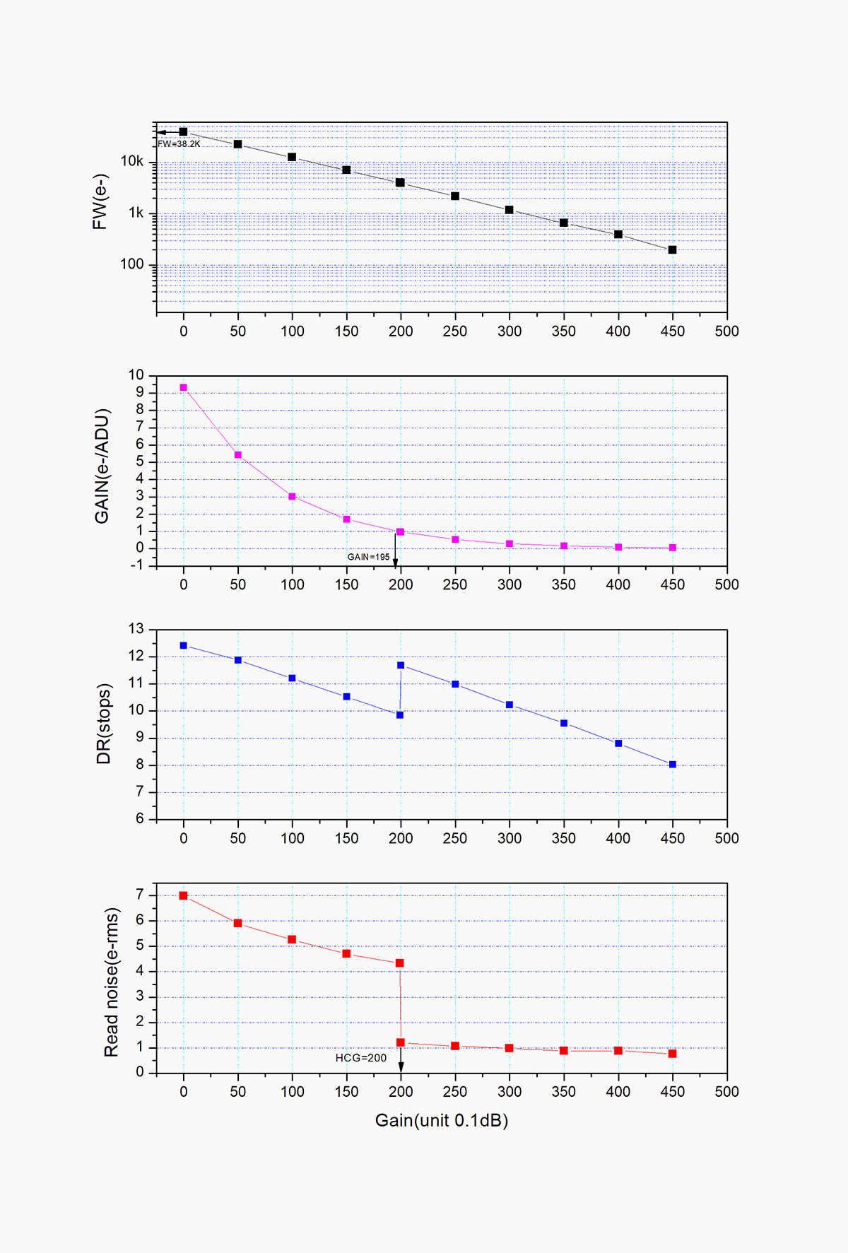 Readout noise includes pixelnoise, circuit noise, and ADC quantization noise. The lower the readout noise, the better. As can be seen, the readout noise of ASl662 is very low compared to CCD camera. The built-in HCG mode can effectively reduce the readout noise at high gain and allow the camera to maintain the same high dynamic range as it does at low gain.