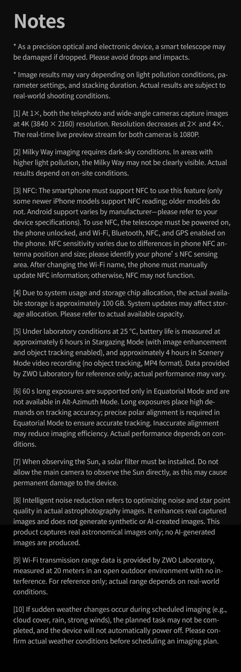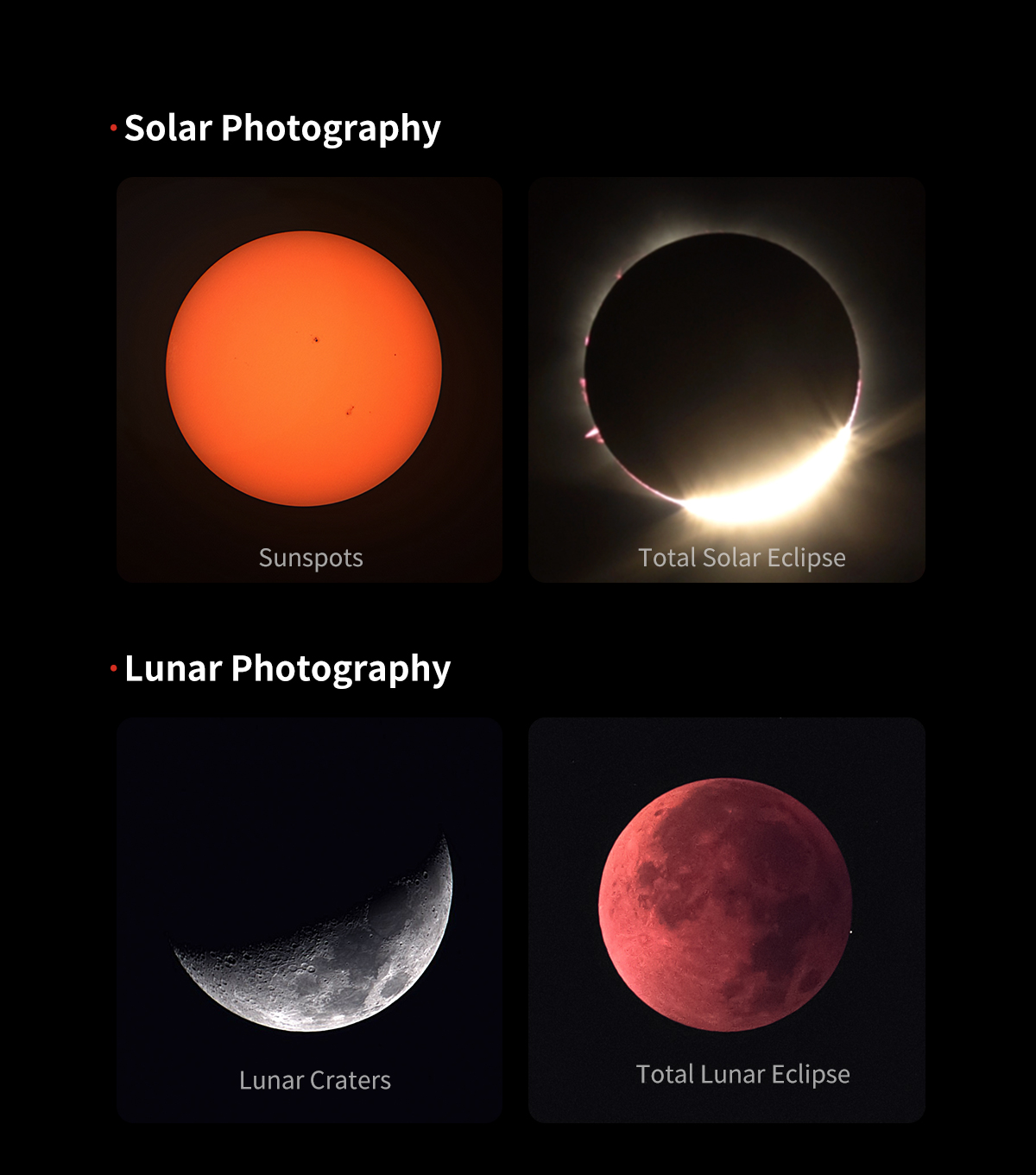 A dual-lens system with 4K wide-angle and telephoto cameras, elevating smart telescope imaging to a professional level. Powered by a telephoto IMX585 (1/1.2″, 4× larger light-sensitive area vs. S30) sensor and a wide-angle IMX586, it delivers 4× higher resolution, lower noise, and cleaner, more natural image quality.